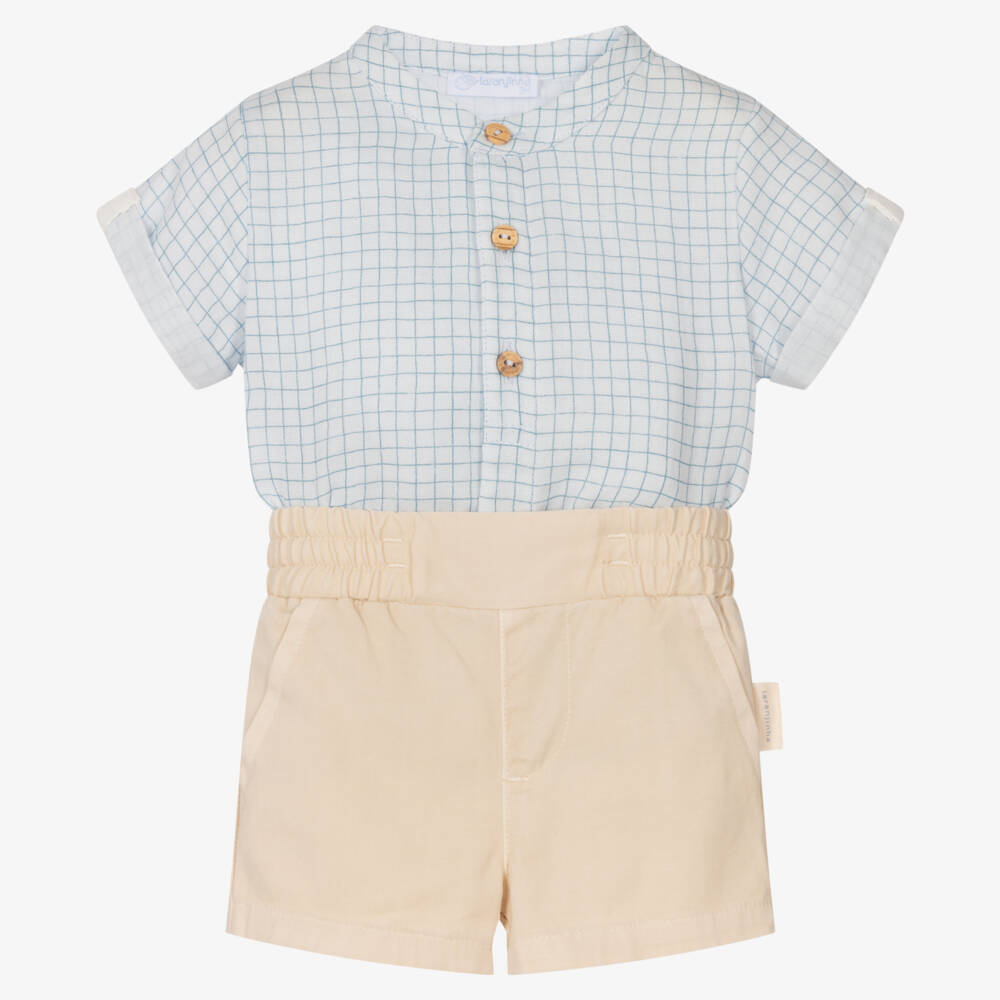 Smart casual pale blue shirt and beige shorts set for little boys from Laranjinha, made in soft cotton for ultimate comfort. The lightweight, collarless shirt has a blue check pattern and rolled-up sleeve cuffs. It fastens with accent wooden button on the top half and concealed poppers on the lower half for a neat finish. The twill shorts have slanted pockets on the front and are easy to pull on with the elasticated waistband.