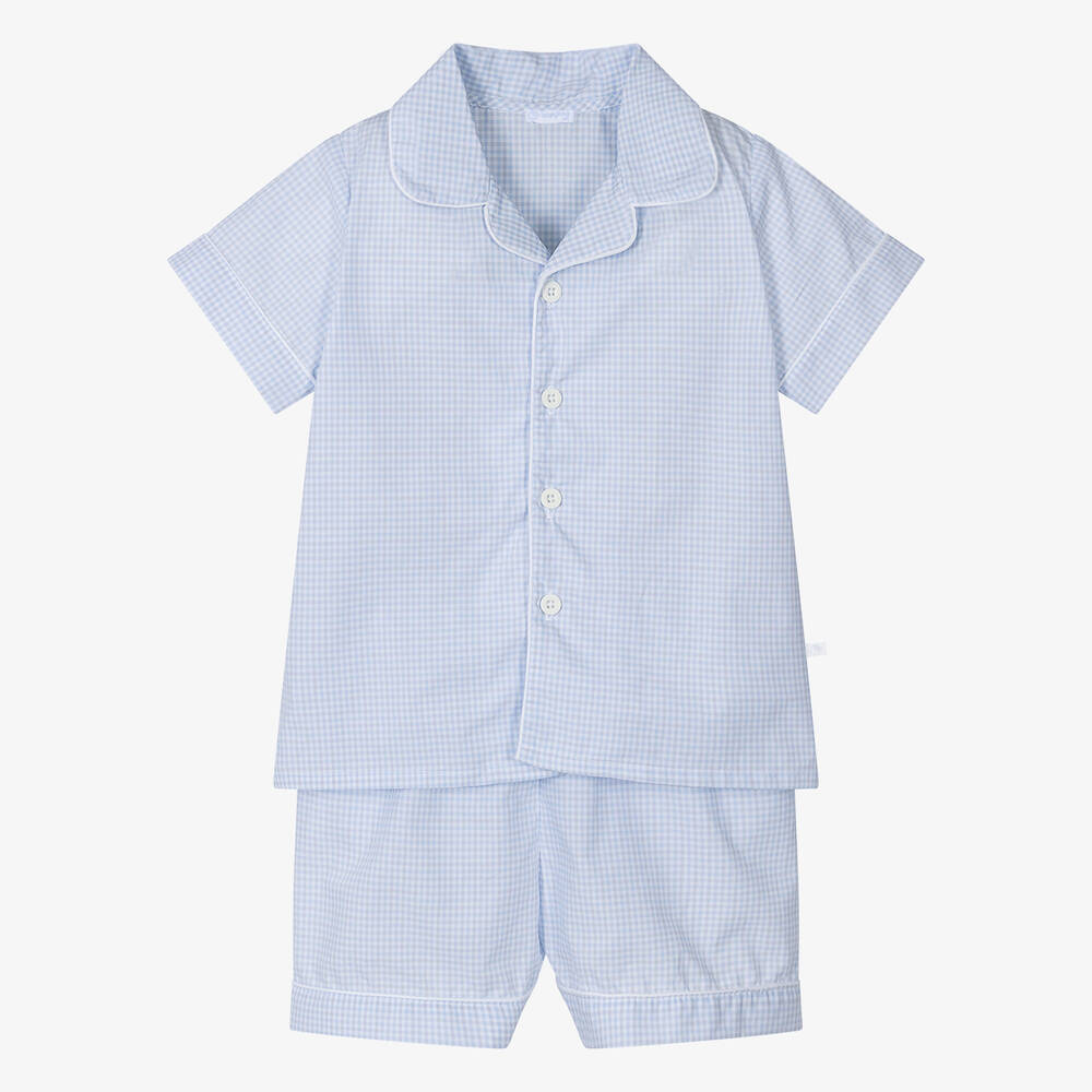 Traditional cotton pyjamas for boys by Laranjinha, in a white, blue and grey check pattern. Soft and lightweight, the short-sleeved top has an open revere collar and front button fastenings. The matching shorts are gently elasticated on the waist for comfort. Both pieces have a smart white piping trim to complete the look.
