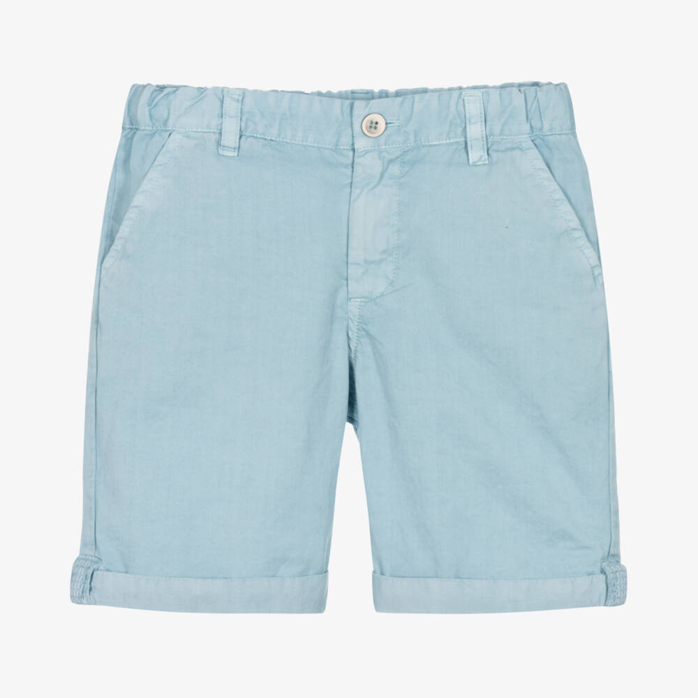Light blue cotton shorts for boys from Laranjinha, made in lightweight cotton twill. A useful wardrobe staple, they have classic styling with slanted pockets on the front, jetted pockets at the back, and fixed turn-ups. They fasten with a zip and button and have an adjustable waist for a comfortable fit. There is a small logo patch on the back for a discreet designer finish.