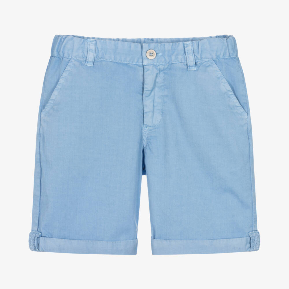 Blue cotton shorts for boys from Laranjinha, made in lightweight cotton twill. A useful wardrobe staple, they have classic styling with slanted pockets on the front, jetted pockets at the back, and fixed turn-ups. They fasten with a zip and button and have an adjustable waist for a comfortable fit. There is a small logo patch on the back for a discreet designer finish.