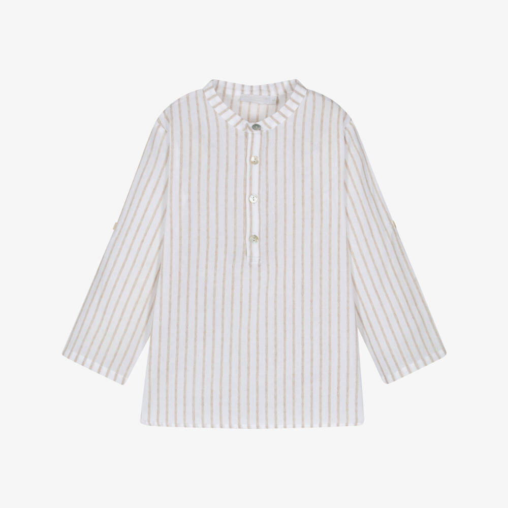 Striped cotton popover shirt for boys by Laranjinha, in ivory and beige. Soft and lightweight, this relaxed style has a round neck and a half-button placket on the front. For a more casual look, the sleeves can be rolled up and secured with tabs, and the hem is split for ease of movement.