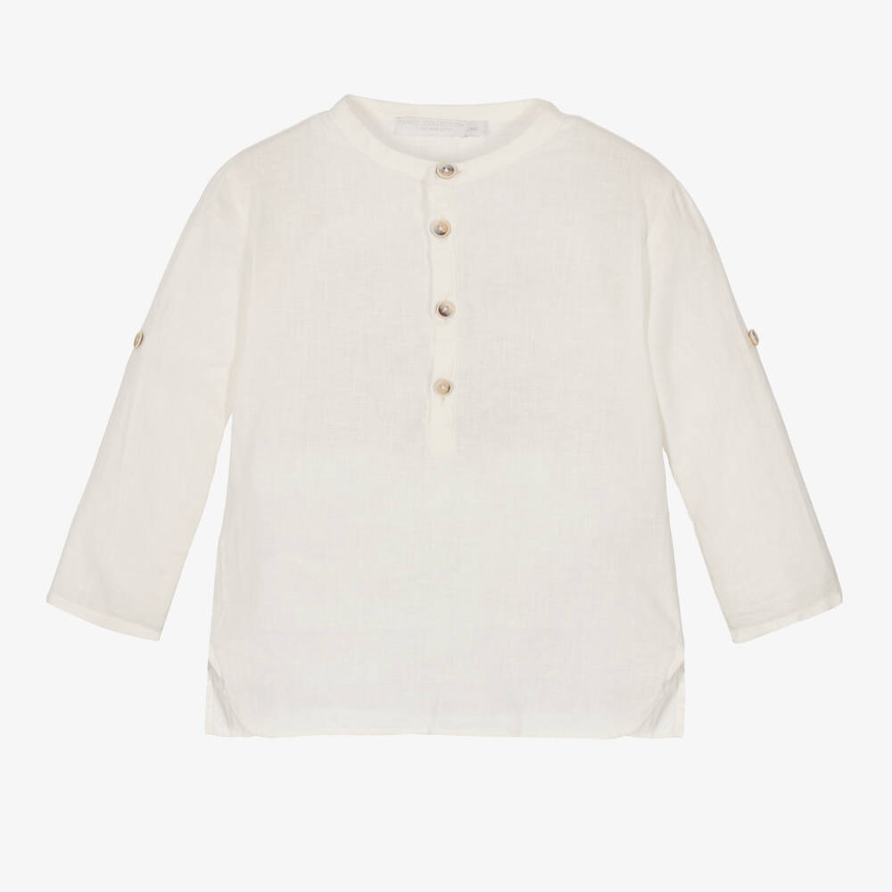 Ivory popover shirt for boys from Laranjinha, in a soft and lightweight linen and cotton blend. Stylish for warmer days, this round neck design has a half button placket on the front and sleeves that can be rolled up and secured with a button. The hem is shaped at the front and split at the sides for ease of movement.