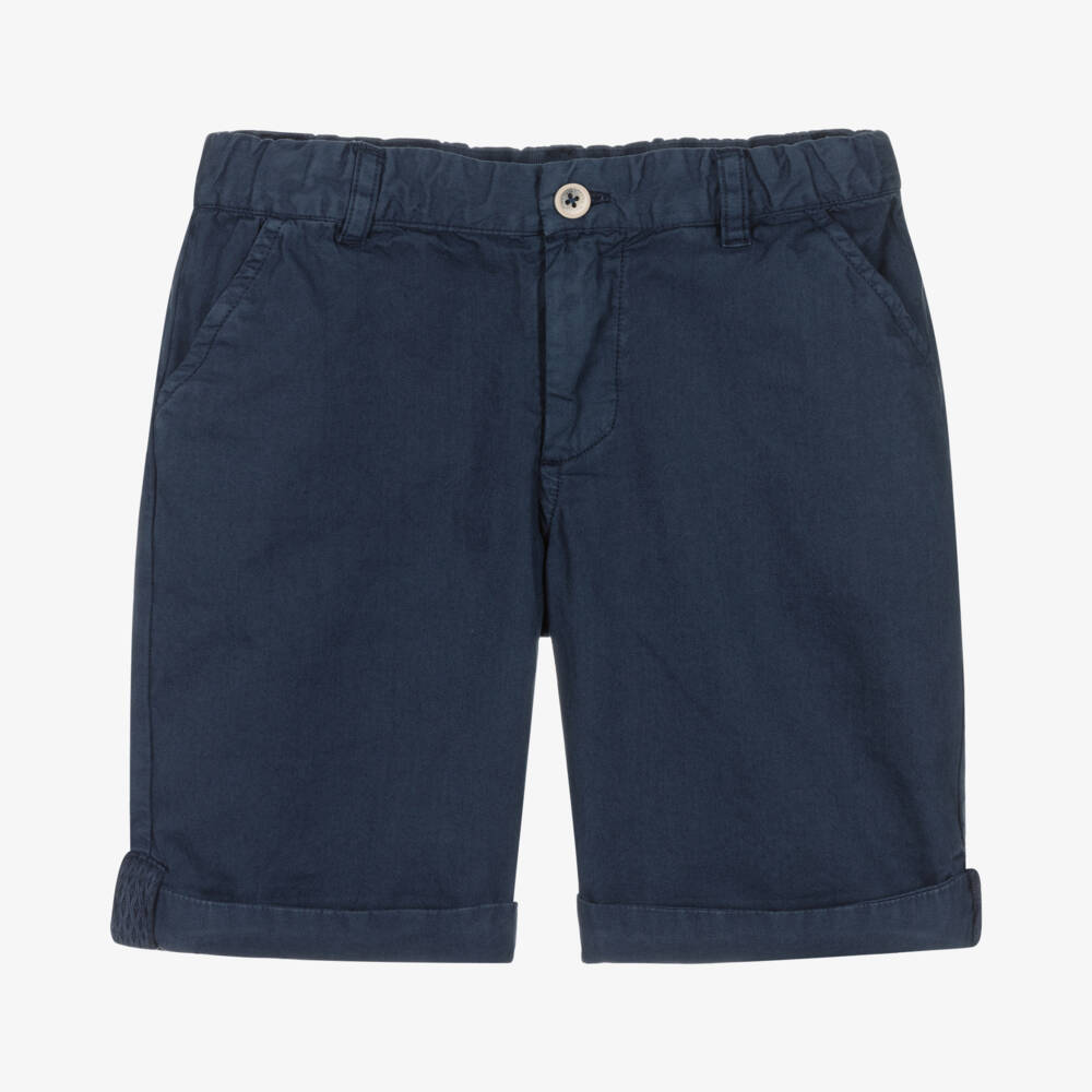 Navy blue cotton shorts for boys from Laranjinha, made in lightweight cotton twill. A useful wardrobe staple, they have classic styling with slanted pockets on the front, jetted pockets at the back, and fixed turn-ups. They fasten with a zip and button and have an adjustable waist for a comfortable fit. There is a small logo patch on the back for a discreet designer finish.