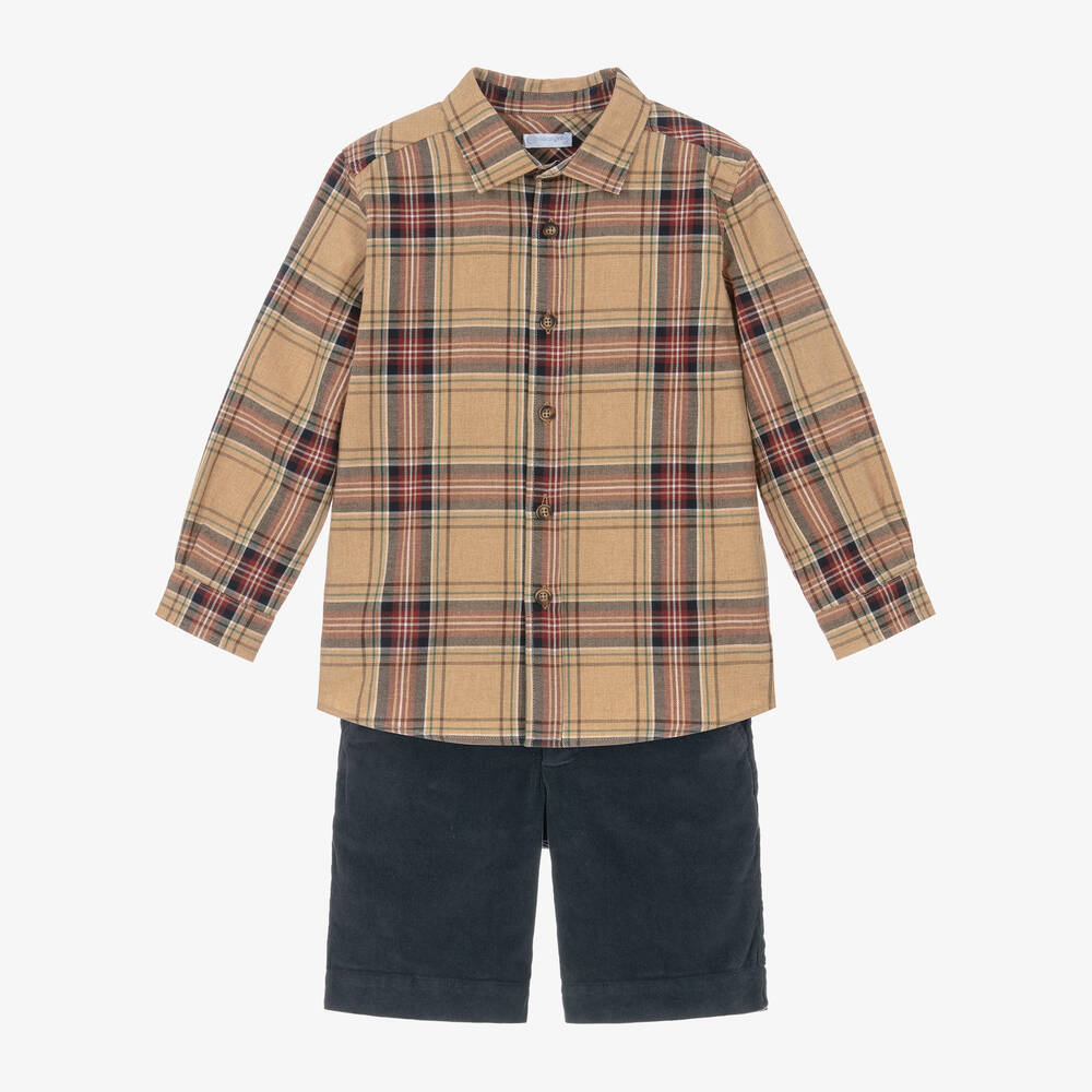 Casual and comfortable, a cotton shorts set for boys by Portuguese brand Laranjinha. The beige and red checked, twill shirt fastens with branded buttons on the front and cuffs, and has a logo tab on the back. The navy blue, needlecord shorts have a stretchy, adjustable and elasticated waistband for a great fit. There are useful front pockets and faux pockets around the back. They fasten with a front button and zip.