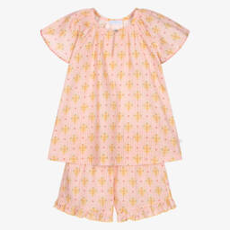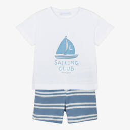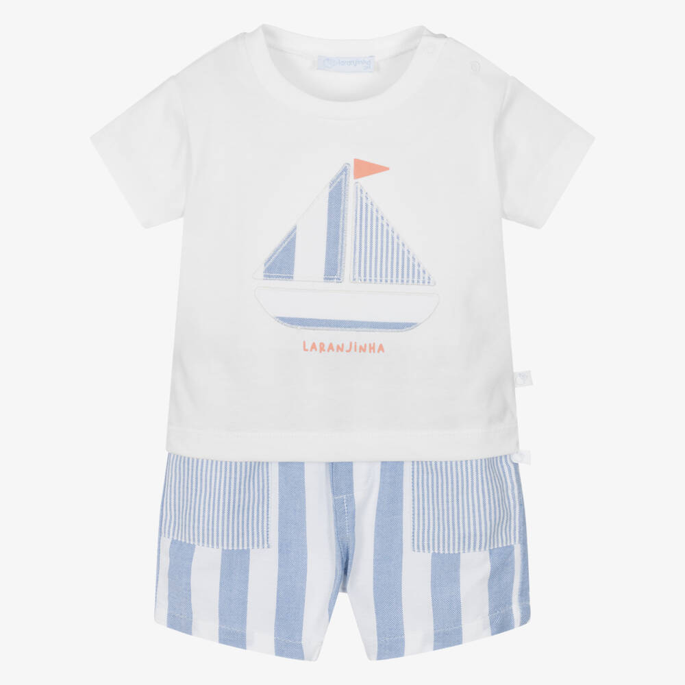 For little boys from Laranjinha, a white and blue striped shorts set made in soft cotton. The jersey T-shirt has a sweet sail boat on the front and, keeping with the nautical theme, the striped, woven shorts match the sails.