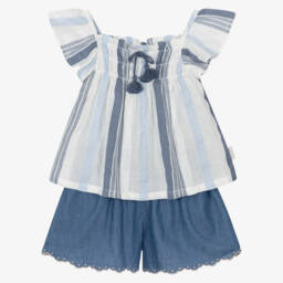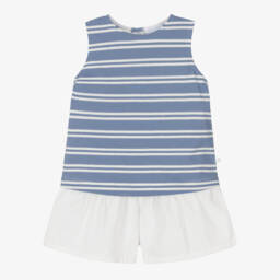 Boys White & Blue Striped Cotton Shorts Set