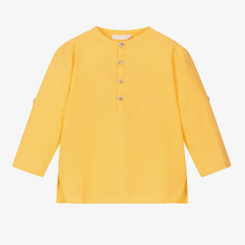 Dark yellow popover shirt for boys from Laranjinha, in a soft and lightweight linen and cotton blend. Stylish for warmer days, this round neck design has a half button placket on the front and sleeves that can be rolled up and secured with a button. The hem is shaped at the front and split at the sides for ease of movement.