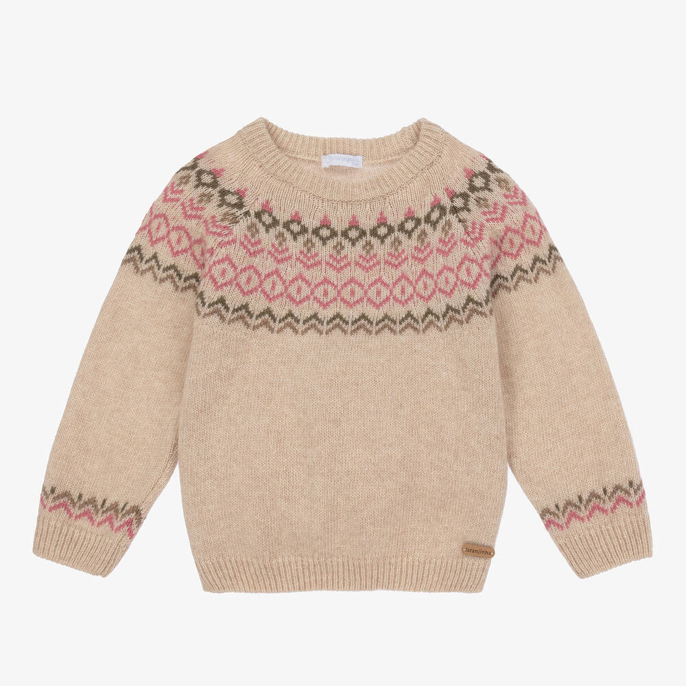 Warm beige sweater for girls by Laranjinha, knitted in a luxurious wool and cashmere blend. It has a pink and green fair isle design across the front, back and the sleeves. A small wooden-style logo badge is sewn near the hem for a subtle, branded touch.