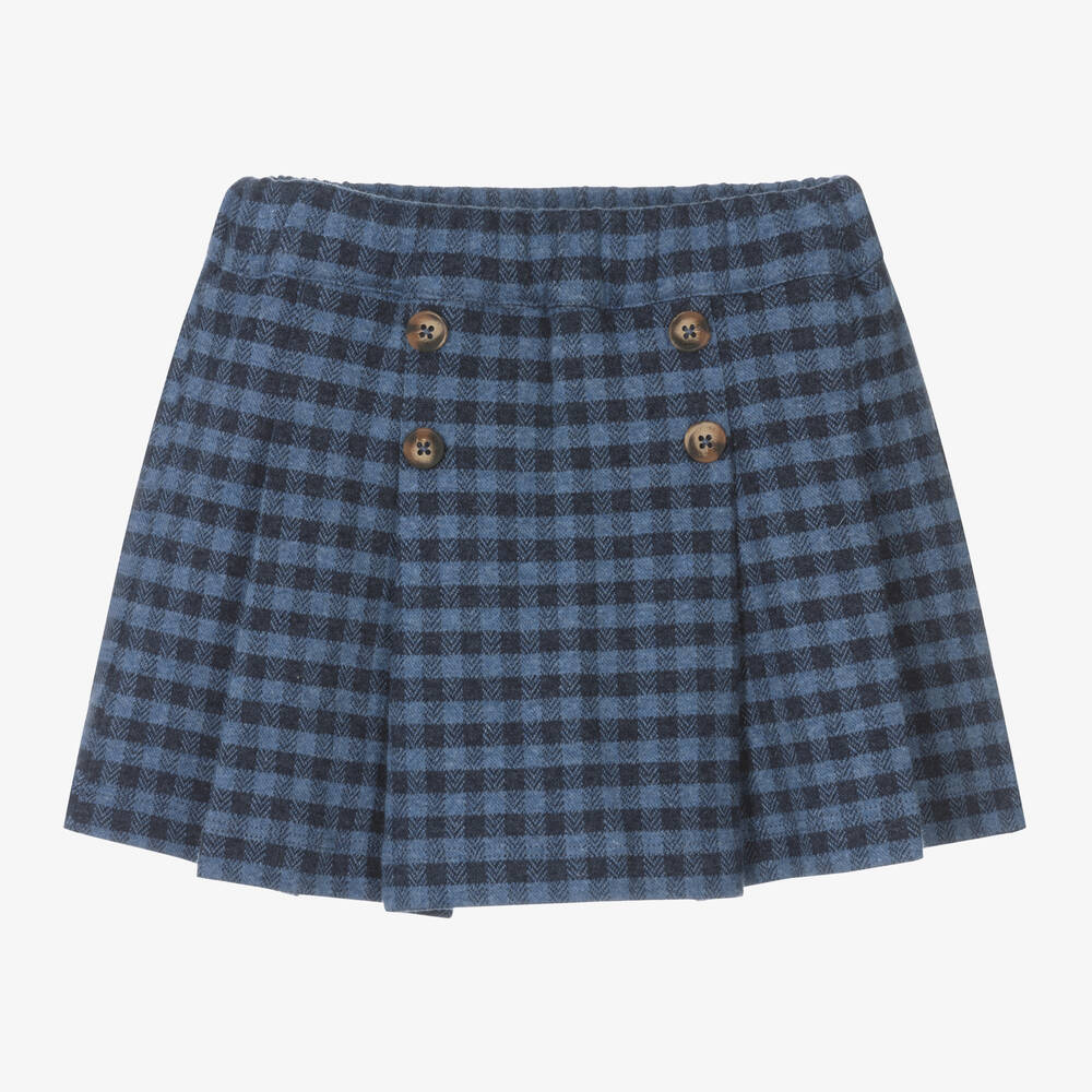 Smart skort for girls by Portuguese brand Laranjinha, checked in shades of blue. Beautifully comfortable, it is made in soft, brushed cotton with pleats and decorative branded buttons on the front. Easy to wear, it has a gently elasticated waistband and simply pulls up.