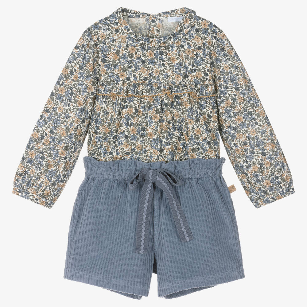 A lovely cotton blouse and shorts set for girls by Portuguese brand Laranjinha. The blouse is patterned in a beautiful beige and blue floral print, with a classic Peter Pan collar and a pretty ruffle trim. It fastens with buttons on the back. The corduroy shorts have a gently elasticated waist, with a grosgrain and ric rac bow fixed on the front.