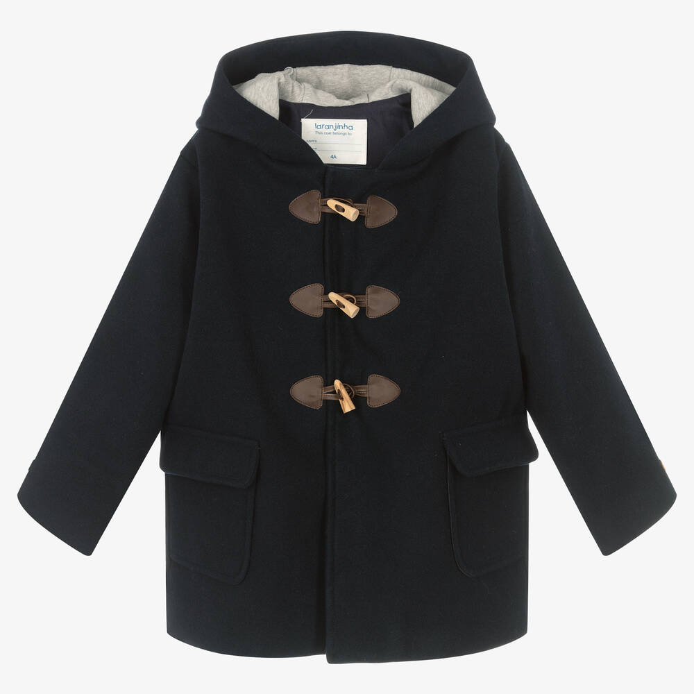 Traditional style navy blue duffle coat for girls by Portuguese designer Laranjinha, with a hood. Made in beautifully soft, cosy, felted fabric, it has wooden toggle fastenings on the front, with brown faux leather loops. Beneath the toggles the coat fastens with poppers and is lined with soft cotton twill for comfort. There are useful patch pockets on the front and a faux suede logo tab on one sleeve.
