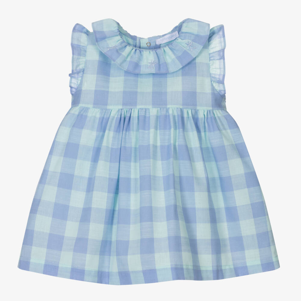 Lovely blue and mint green dress for little girls from Laranjinha, made in lightweight cotton. With a traditional A-line shape and delicate frills on the shoulders, this pretty dress is checked in contrasting hues and finished with tonal embroidered flowers on the collar. For quick and easy dressing, it has popper fastenings on the back.
