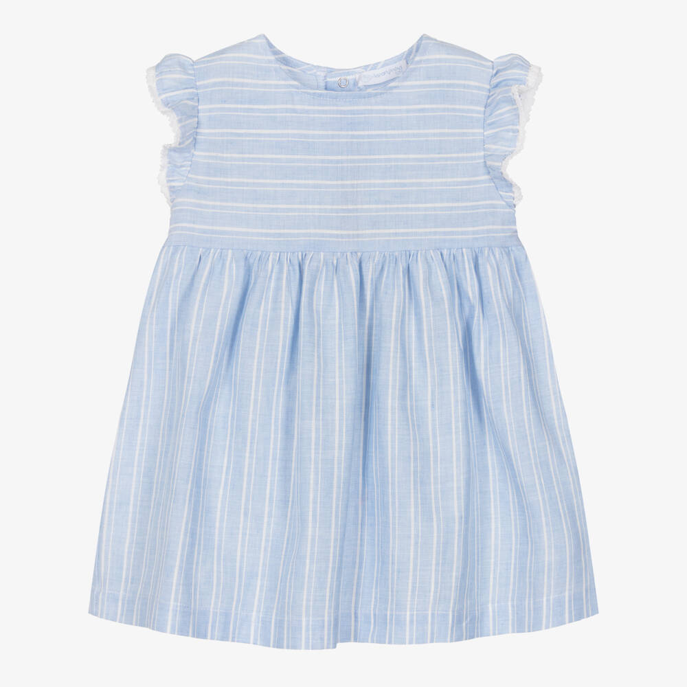 A pretty pale blue and white striped dress for little girls by Laranjinha, woven in soft blend of organic cotton and linen. It has feminine frills around the shoulders, trimmed with white embroidered lace. There are easy fastening poppers at the back to help with dressing.