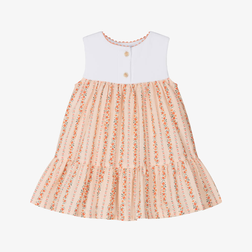 Sweet white and orange cotton dress for girls by Laranjinha, patterned with a floral and gingham check. This sleeveless style has a comfortable, soft jersey bodice with cute ric rac neck trim and a pretty ruffle around the hem.