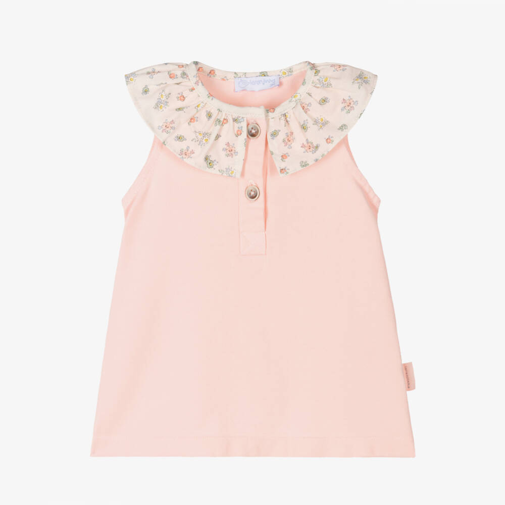 So sweet for little girls, this pale pink cotton piqué dress is from Laranjinha. This cute sleeveless style has a pretty ivory ruffle collar printed with pastel-coloured flowers and a comfortable A-line shape.