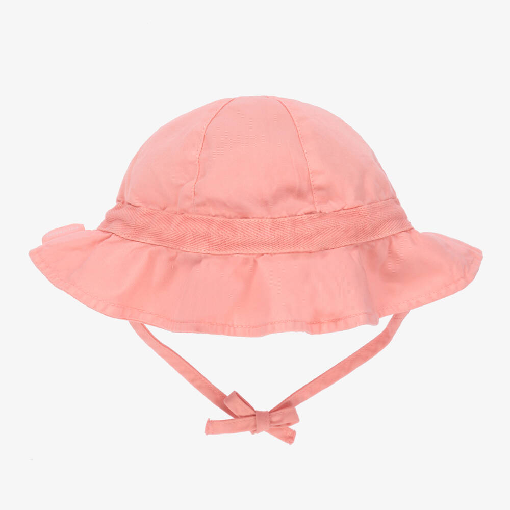Sweet pink sun hat for little girls by Laranjinha, made in smooth cotton twill. It has a pretty frilled brim, with a lightweight lining and secures with ties under the chin.