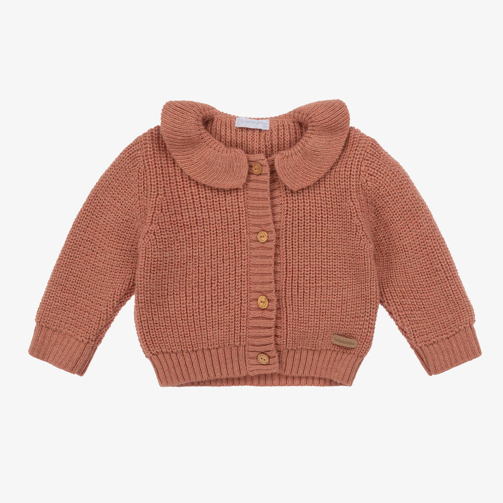 Sweet terracotta pink cardigan for little girls by Laranjinha. Knitted in a soft wool and viscose blend, this long-sleeved layering piece fastens with wooden-style buttons on the front and has a cute rounded collar. A neutral logo badge, sewn near the hem, finishes the style with subtle branding.