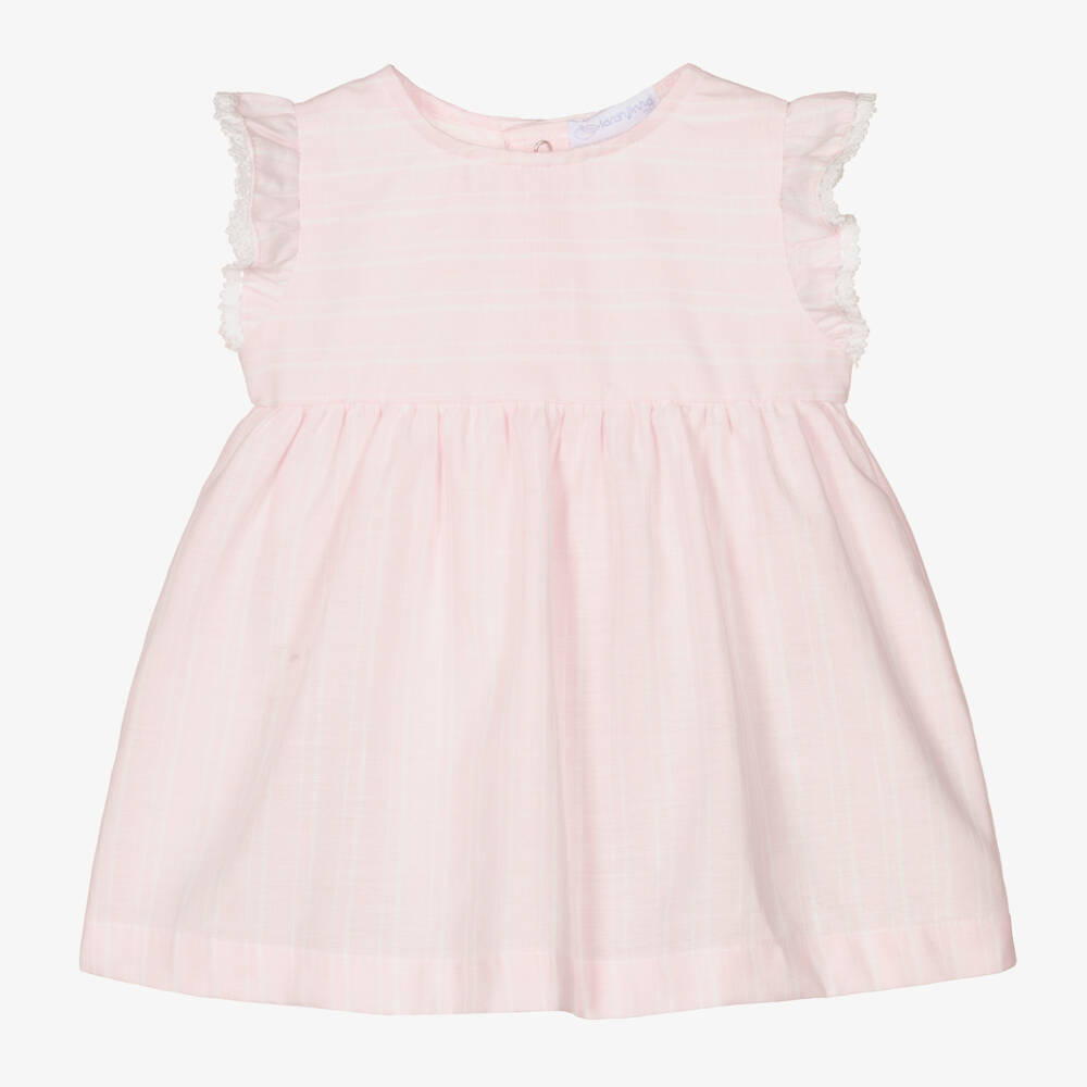 Lovely pink sleeveless dress for little girls from Portuguese brand Laranjinha. Made in lightweight cotton and with a flowy silhouette, it is ideal for warmer days. It is printed with white stripes and has ruffles on the straps trimmed with crochet lace. For quick and easy dressing, there are popper fastenings on the back.