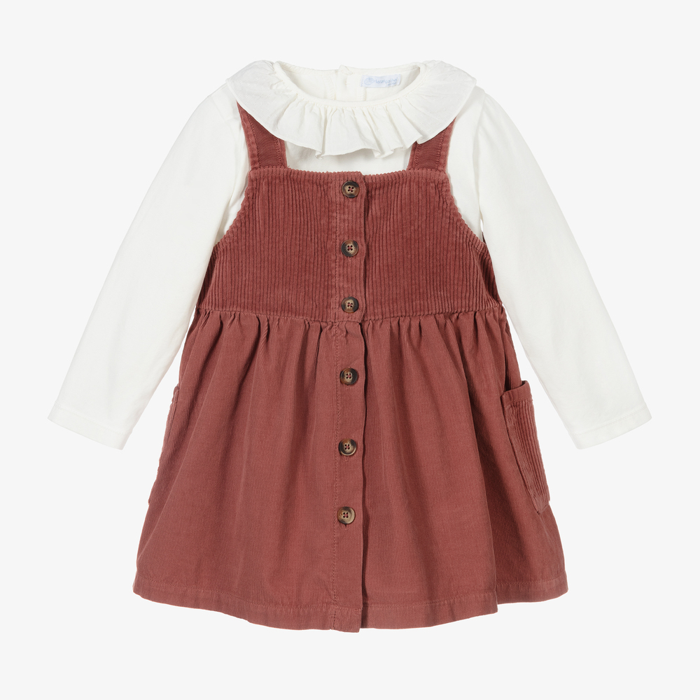 Pretty dress set by Laranjinha. The super soft ivory cotton jersey top has an embroidered ruffle around the neckline. The burgundy red pinafore dress has an elephant corduroy bodice and pockets, with a contrasting needlepoint corduroy skirt. It fastens with faux tortoiseshell buttons on the back.