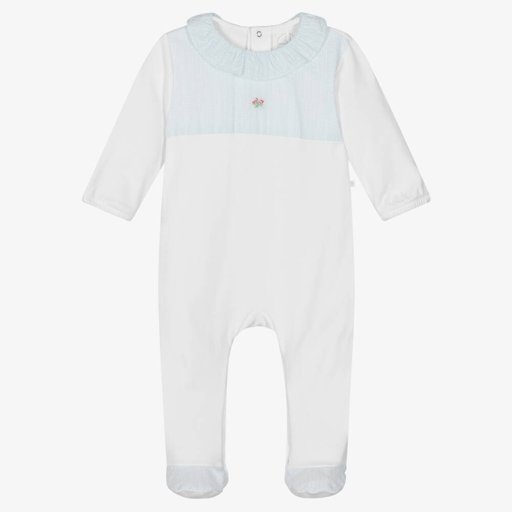 White cotton babygrow for girls by Laranjinha, made in soft and comfortable jersey. It has a lovely aqua blue seersucker panel on the front with a sweet embroidered floral motif and a matching ruffle collar and feet. The cuffs are gently elasticated and the babysuit fastens with poppers on the back and between the legs.