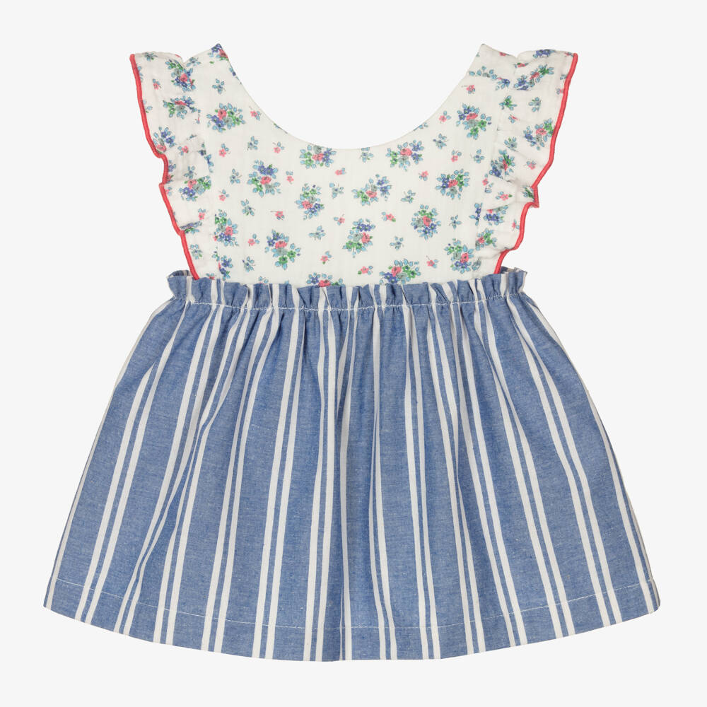 Sweet pinafore dress for little girls from Laranjinha, made in lightweight cotton blend. The white top has a dainty floral print and red trims. The skirt is blue with white stripes and the gathered hem gives volume. For a better fit, the straps are adjustable with internal button fastenings and the waist is elasticated.