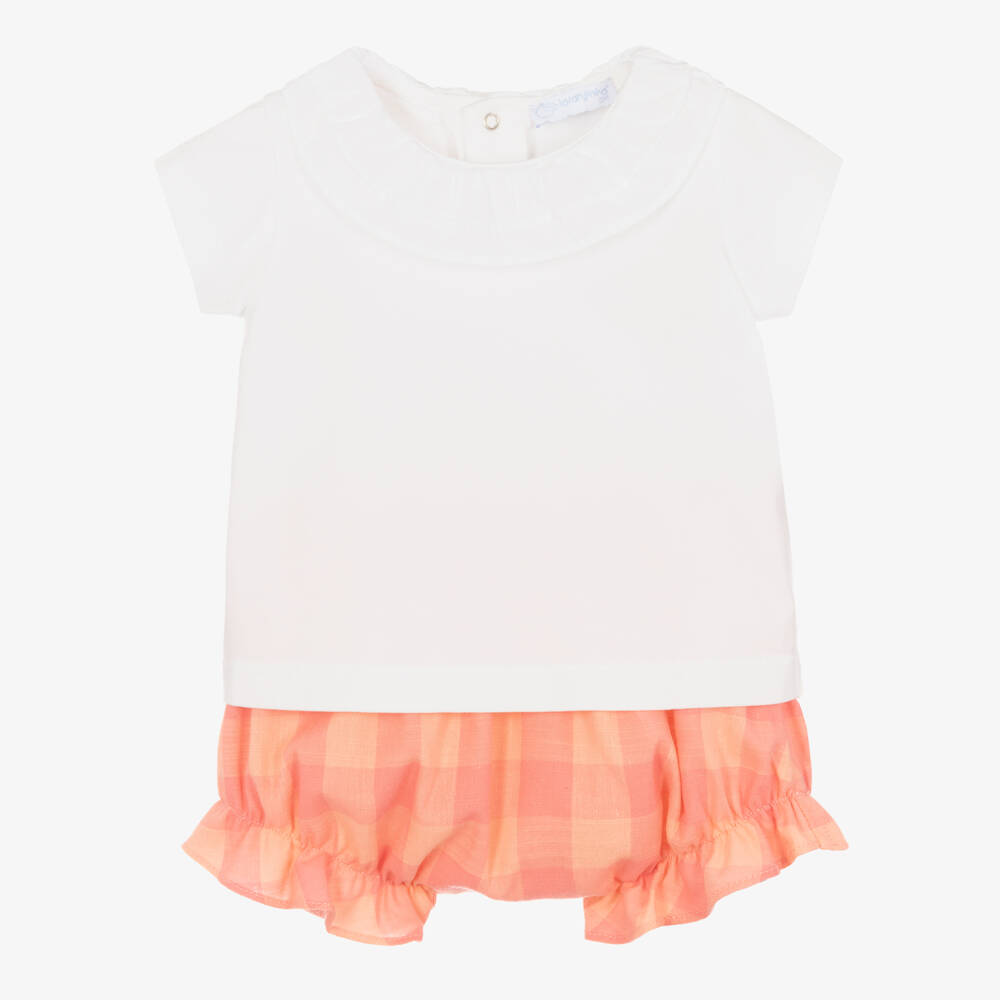 Cute white and coral pink shorts set for little girls from Laranjinha. The top is made in soft and stretchy cotton jersey, with a round voile collar which is lightly ruffled for a pretty finish. The lightweight shorts are checked and the waist is elasticated for comfort.