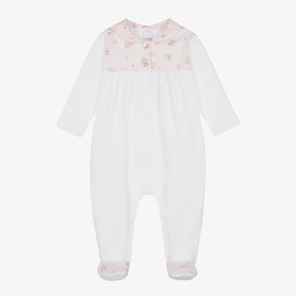 White cotton jersey babygrow for girls by Laranjinha. This comfortable babygrow has a smart finish with a pink striped panel on the neckline with a pretty floral print and mother-of-pearl fastenings. Easy-to-use poppers on the front and between the legs help make dressing and changes stress-free.