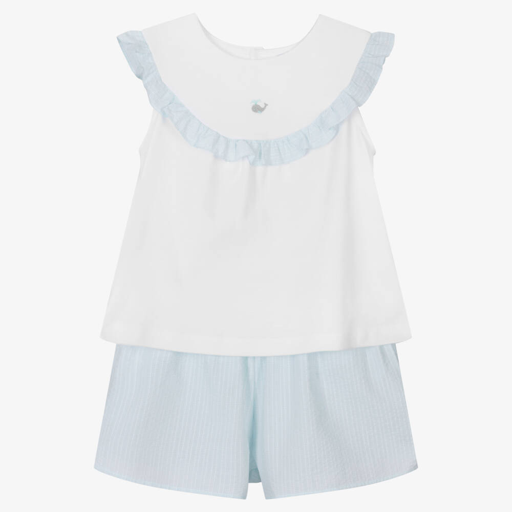 A lovely white and pale mint green short pyjamas for girls by Laranjinha, made in soft cotton. The lightweight shorts have a delicate striped pattern, with a gently elasticated waist for a comfortable fit. The jersey top has a pretty ruffle trim that matches the shorts, with an embroidered floral motif on the front. There are mother-of-pearl button fastenings on the back for a traditional finish.