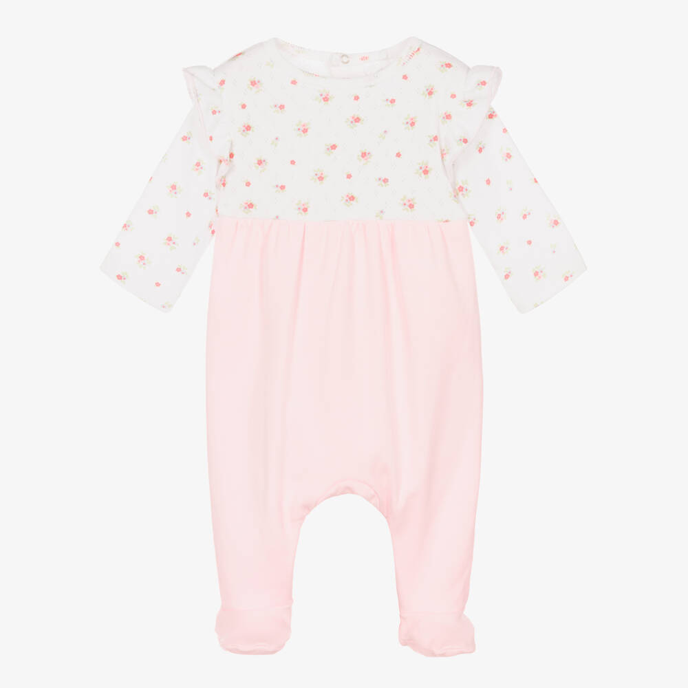 Cute white and pink babygrow for girls from Laranjinha. Made in soft cotton jersey to be comfortable against delicate skin, it has popper fastenings on the back and both legs to make dressing and changes stress-free. The white top has a pretty floral print and is finished with frills on the shoulders.