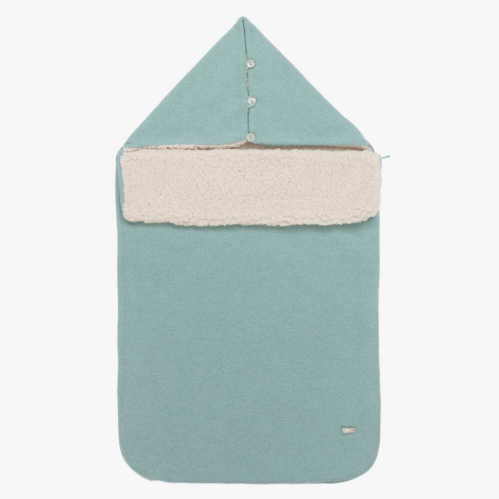 A sea blue nest for baby boys by Laranjinha, knitted in a merino wool, viscose and cashmere blend. This nest has a warm fleecy lining to keep your little one cosy and comforted. The mother-of-pearl button fastening hood and zip-up side allow the nest to open up.