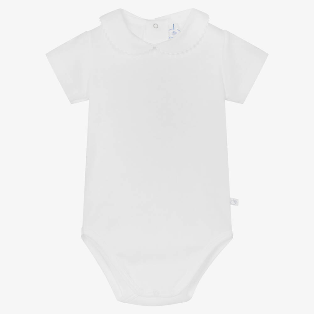 White short-sleeved bodysuit for boys and girls by Portuguese designer Laranjinha. Soft, stretchy and classically styled, it is made in comfortable, cotton jersey with a smart poplin collar trimmed in ric rac. Easy to wear, it has poppers on the back and between the legs. It has been treated by Sanitized, which effectively reduces the development of bacteria and odour.