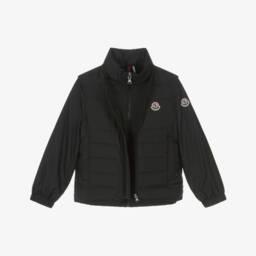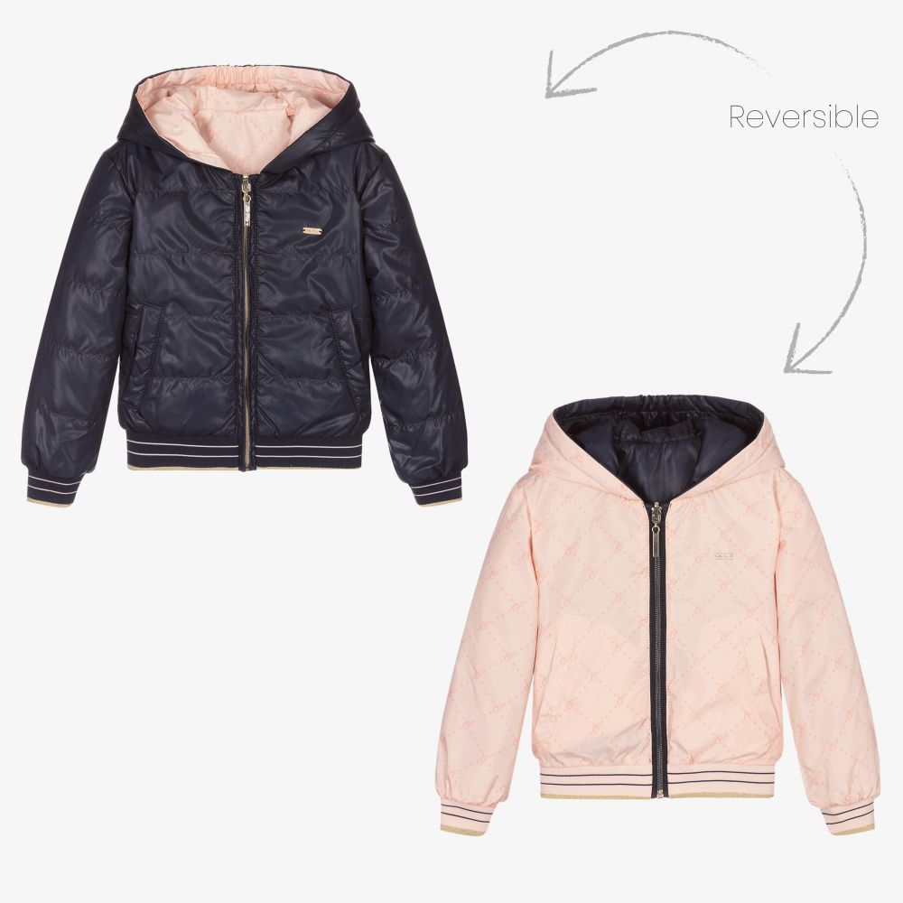 A navy blue and pale pink reversible puffer jacket for girls by Le Chic, made with smooth recycled polyester. The blue side is trimmed with a gold metal logo plate. The pink side is patterned with a repeat gold logo motif. It fastens with a front zip and both sides have pockets. It has ribbed elasticated cuffs with a metallic gold thread.