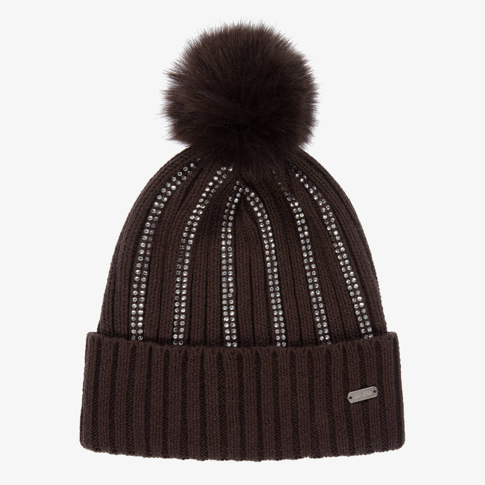 Brown pom-pom hat for girls by Dutch brand Le Chic, made in a chunky knit. It has bands of sparkling diamantés on the front and a silver metal logo tab on the turned-up brim.
