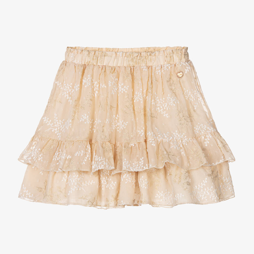 Pretty beige skirt for girls by Le Chic, embroidered with gold and white floral vines. Effortlessly cute, this tiered, ruffle style has an gold logo heart charm sewn onto the waist for a touch of sparkle. For comfort, there is a soft, lightweight cotton lining and a stretchy elasticated waistband.
