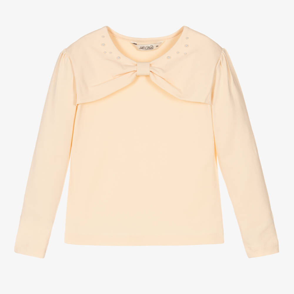 Stylish orange-beige top for girls by Le Chic, made from soft and stretchy cotton jersey. The front of this top has an integrated statement bow, trimmed with faux pearls for a beautiful, feminine look. There is a small branded tab on one sleeve for a subtle designer touch.