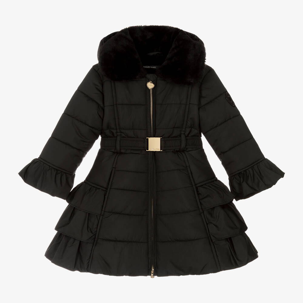 Pretty black puffer coat for girls by Le Chic, soft, silky and with a sheen. It has a faux fur collar, a cosy, detachable hood that is secured with a zip, and a logo badge on one sleeve for instant brand recognition. There are ruffles on the cuffs, the sides and the back, as well as useful concealed pockets on the front seams. The front zip fastening has a golden, heart-shaped logo pull tab, and the detachable, elasticated belt fastens with a golden logo clasp, sparkling with a diamanté. It has a fixed bow on the back. The coat has a warm, faux fur upper lining, with a quilted satin lining below.