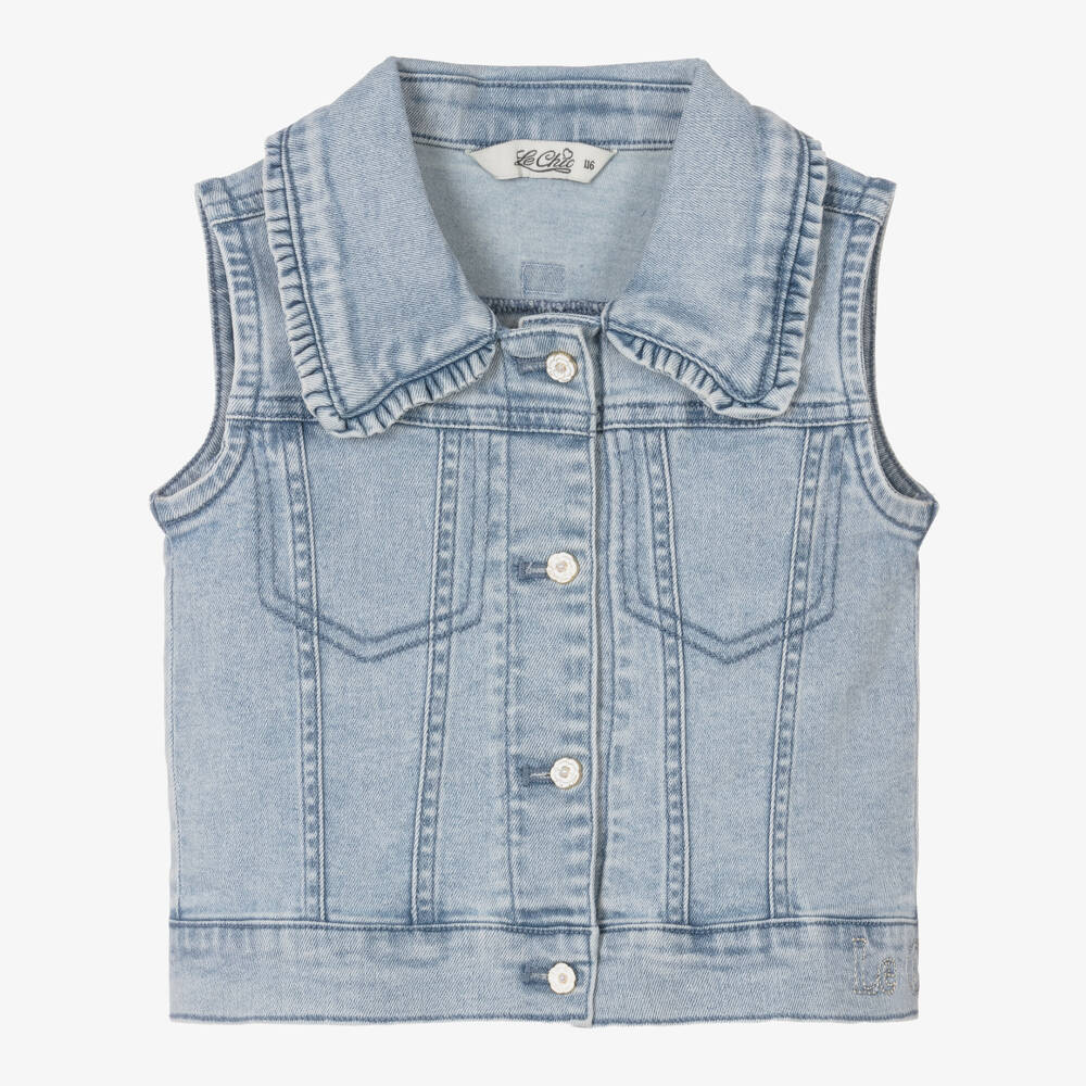 Pretty denim gilet for girls by Le Chic, in a light blue wash. It has a ruffle-trimmed collar and floral button fastenings on the front for added girly detailing. There is a small gold logo tab on the back of the neck and sparkly logo embroidery on the hem, finishing the style with subtle designer touches.