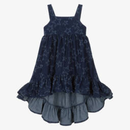 Blue denim jacket for girls by Le Chic, made in soft stretch denim with a classic washed look. It has faux chest pockets and charming shoulder ruffles embellished with pretty faux pearls. There are gold-tone branded buttons, accented with a small diamanté for a finishing touch of sparkle.