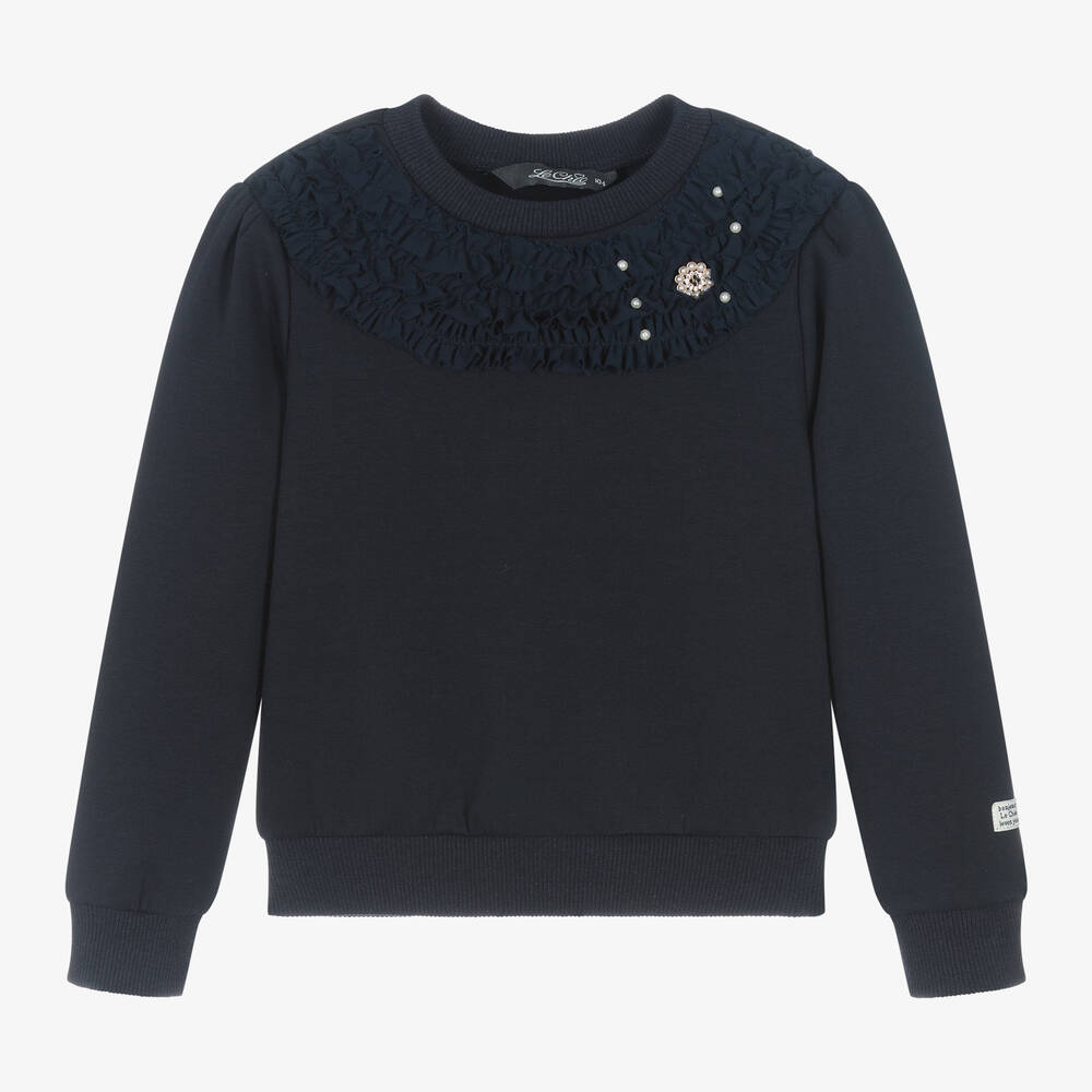 Navy blue sweatshirt for girls by Le Chic, with pretty chiffon ruffle trim on the front. Ideal for elevated casual wear, it is made in comfortable cotton-blend jersey with pearls and diamanté decoration for a stylish touch.