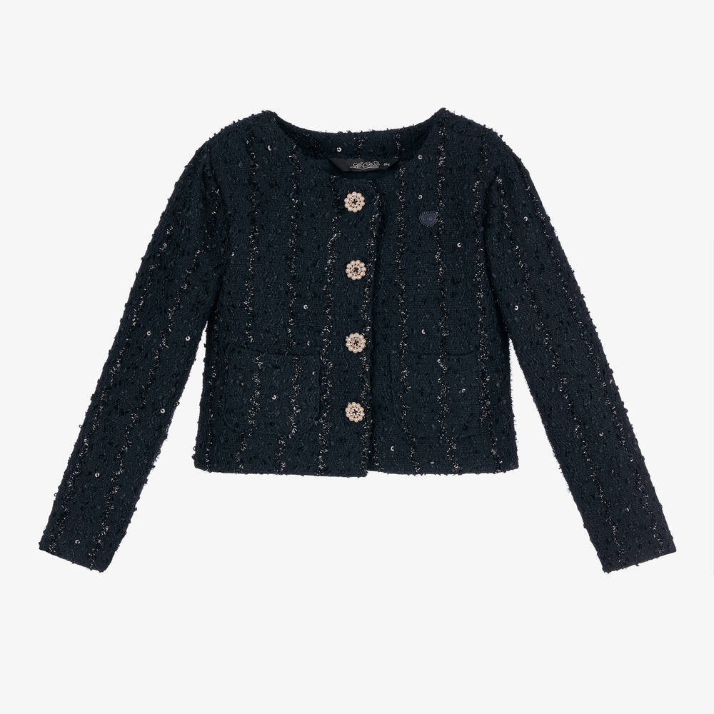 Smart navy blue jacket for girls by Le Chic, ideal for a special occasion. Patterned with wavy, fringed lines of shiny thread and scattered sequins that catch the light beautifully, it fastens with stylish pearl bead and diamanté buttons. There are useful patch pockets on the front.
