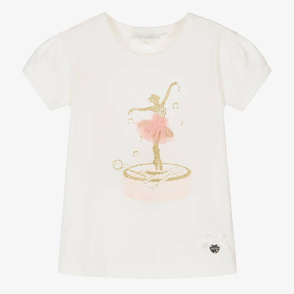 A gorgeous ivory T-shirt for girls by Le Chic, made in the softest cotton jersey. It has a shimmering gold and pink ballerina print on the front, trimmed with gold diamantés, pretty pearls and a 3D tulle tutu appliqué.