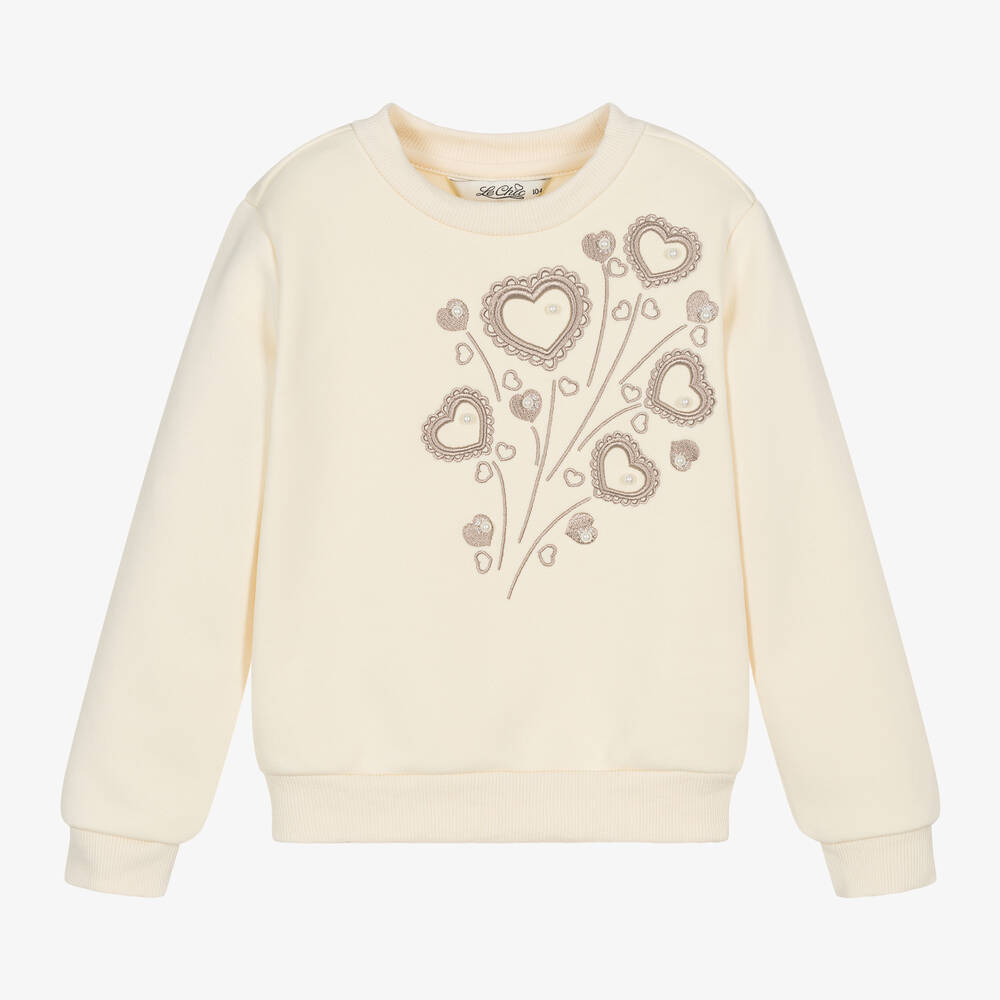 Dark ivory sweatshirt for girls by Le Chic, made in comfortable mid-weight cotton jersey. It features a lovely beige embroidered heart design trimmed with pearl beads for a beautiful touch.