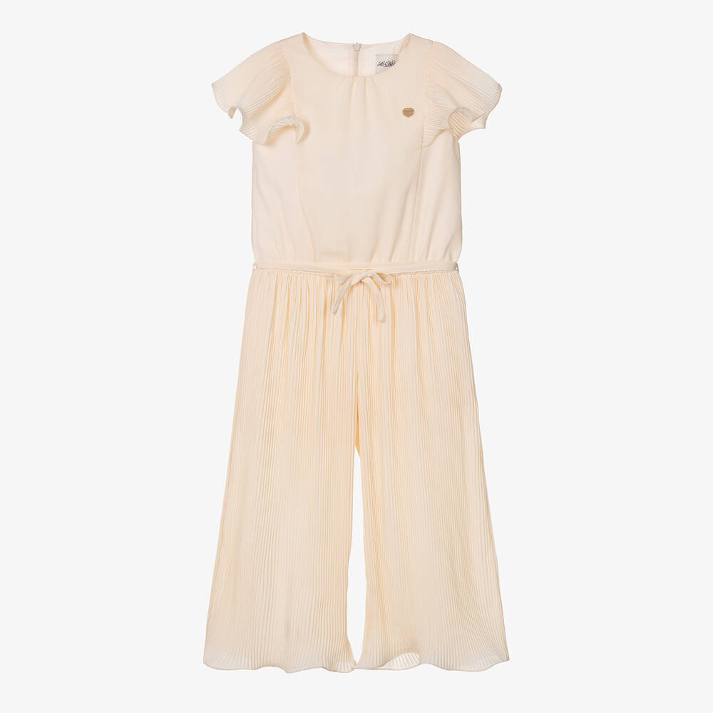 Effortlessly stylish, this ivory jumpsuit for girls is by Dutch brand Le Chic. Made from soft and flowy crêpe, it has pretty plissé on the legs to match the flutter sleeves. There is a golden heart logo charm on the chest and a tie belt for a pretty finishing touch. It is fully lined in lightweight cotton voile, with a concealed zip fastening on the back for a seamless finish.