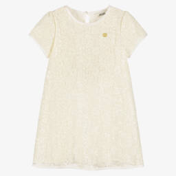 Beautiful ivory dress for girls by Le Chic, made from embroidered chiffon with a delicate ivory and gold floral motif. Designed with pretty ruffle trims, the bodice features a smart collar and pearlised popper fastenings on the front, along with a gold heart logo charm for a designer touch. The elasticated waist and tiered ruflle skirt create a lovely silhouette and the dress is lined in soft satin.