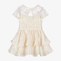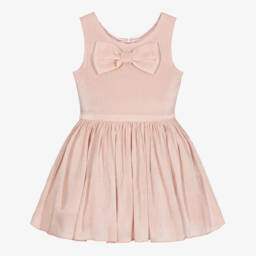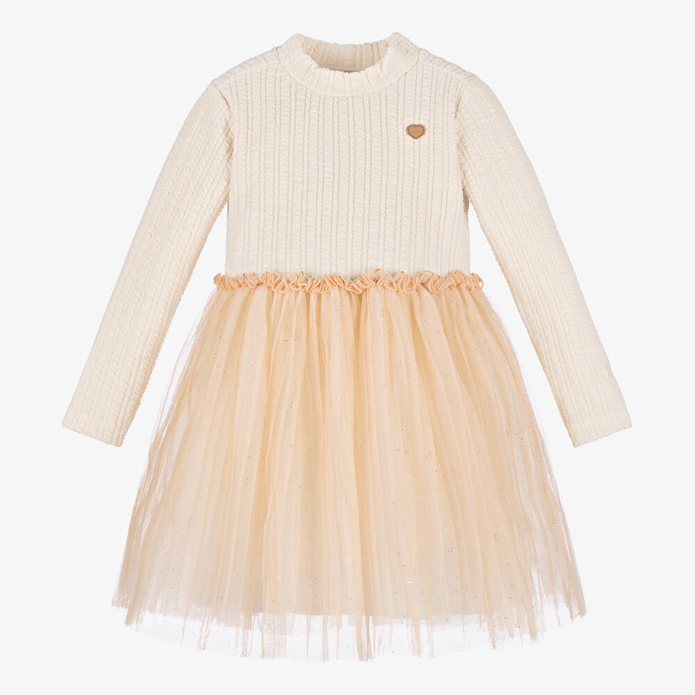A lovely dress for girls by Le Chic, with a comfortable bodice in soft, ribbed seersucker jersey. Ideal for an occasion or elevated casual wear, it has a pleated, peach-pink tulle skirt with gold glitter flecks for a sparkly touch. The signature gold heart logo charm on the chest adds a designer touch.
