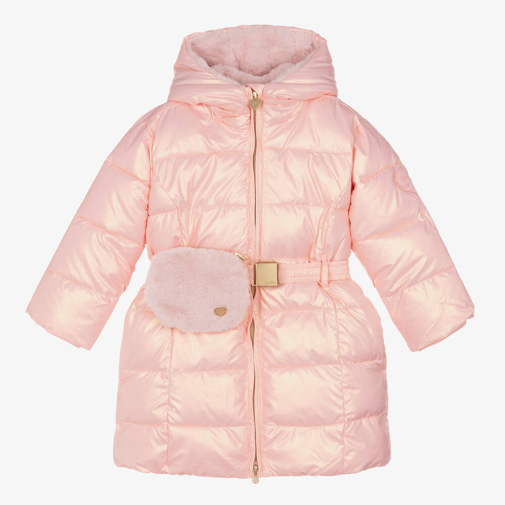 Gorgeous metallic pink puffer coat for girls by Dutch designer Le Chic, with a felted white logo badge on one sleeve for instant brand recognition. It has a detachable faux fur bag on the elasticated belt, which fastens with a zip and has a golden logo heart charm on the front. Beautifully warm, the coat has mid-weight padding, ribbed cuff inserts and a faux fur lining on both the hood and upper part of the coat, with a quilted lining below. The coat has a front zip fastening with a gold logo heart pull tab.