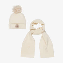 This navy blue hat and scarf set for girls by Le Chic will add a touch of elegance to her winter wardrobe. Cosy and warm, it is made in a soft chunky knit with a metallic gold thread. The hat features a playful faux fur pom-pom and a sequinned heart logo patch on the turned-up brim, whilst the matching scarf is finished with a small satin bow and a branded label.