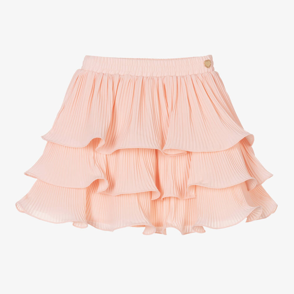 Pretty and feminine for girls, this pale pink tiered ruffle skirt is by Le Chic. Made in finely pleated crêpe chiffon, this elegant design has a gently elasticated waist, with a lightweight cotton lining for added comfort. For an added designer touch, the skirt is finished with a small gold heart charm on the front.