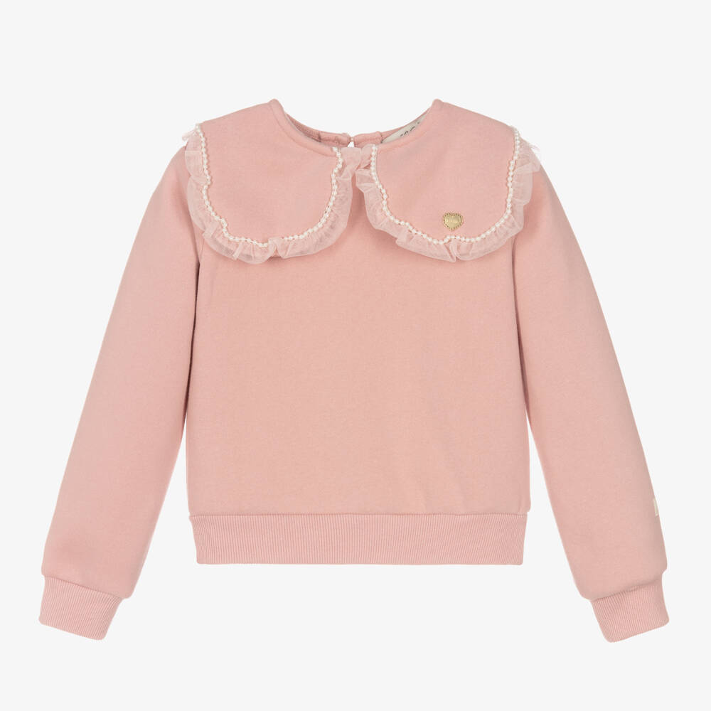 Beautiful sweatshirt for girls in a soft blush pink shade, by Le Chic. It has an oversized Peter Pan collar, trimmed with organza and faux pearls for a sweet, sparkly finish. This cosy and warm style has gently ribbed trims for comfortable wear. It fastens with a keyhole button on the back.