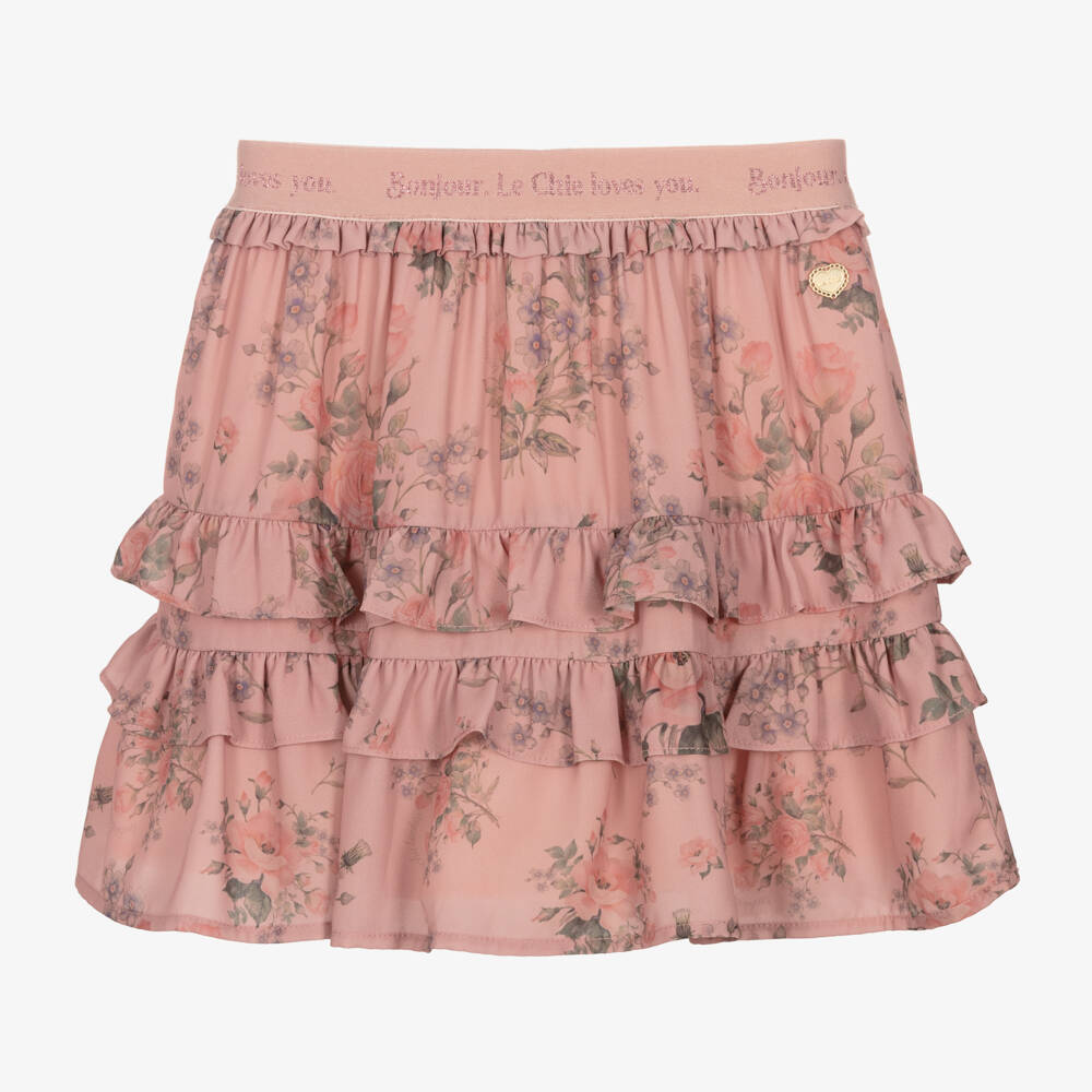 Lovely dusky pink floral skirt for girls from Le Chic, made in soft and lightweight chiffon. Patterned in a delightful floral pattern, this pleated skirt has a tiered design for a flowing look. Fully lined for comfort, it has an elasticated waistband with a sparkling branded logo slogan and a heart logo charm sewn on the front. This item contains 60% recycled materials.